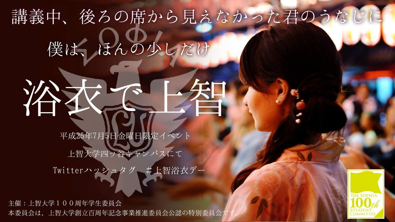 本日、7月5日(金)の終日、上智大学で上智生が1日浴衣で過ごすイベント、上智浴衣デ―が開催中。創立100周年と七夕のお祝いを兼ねた大学初のイベント。